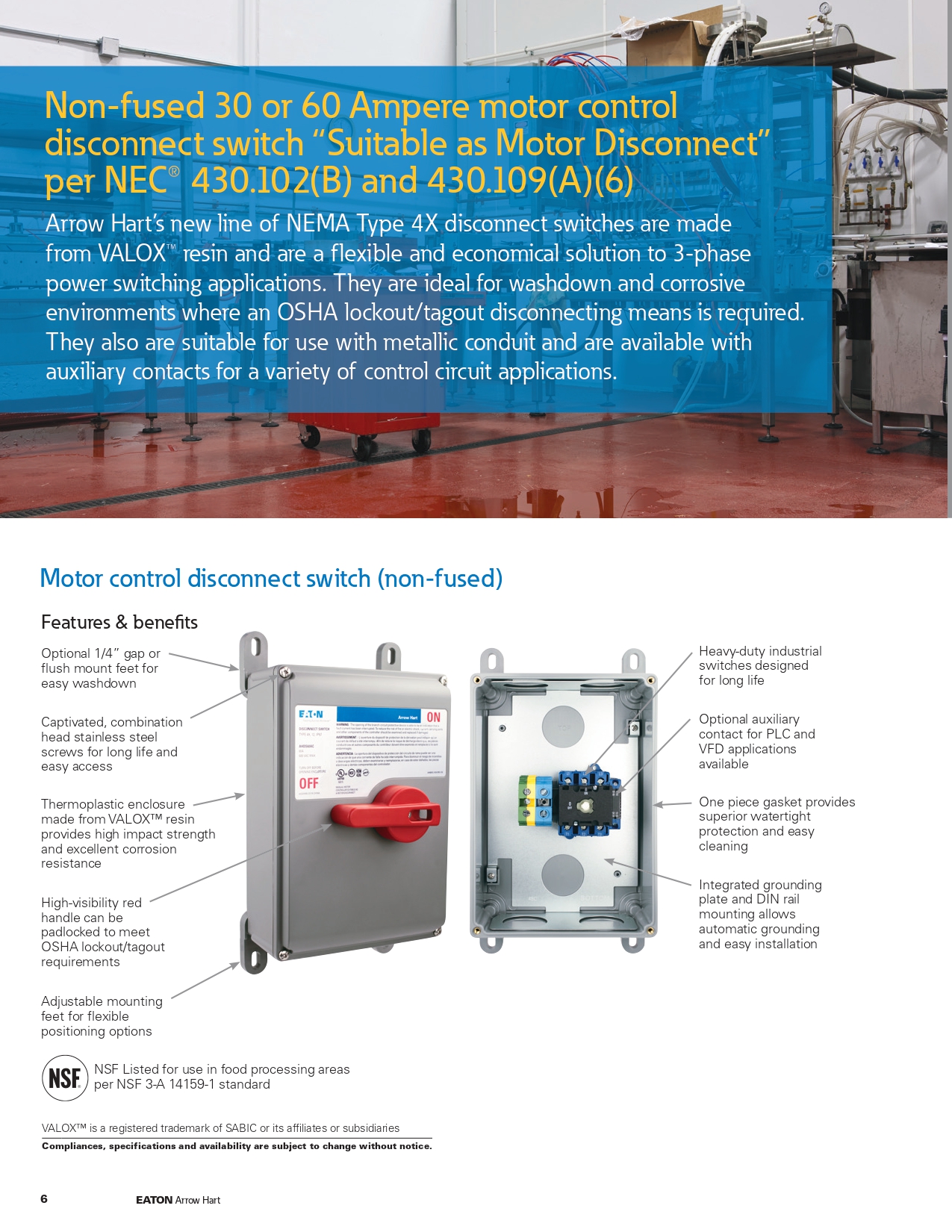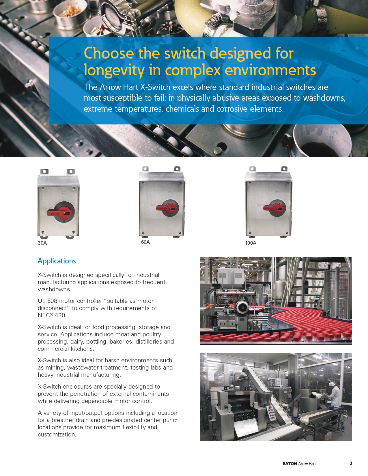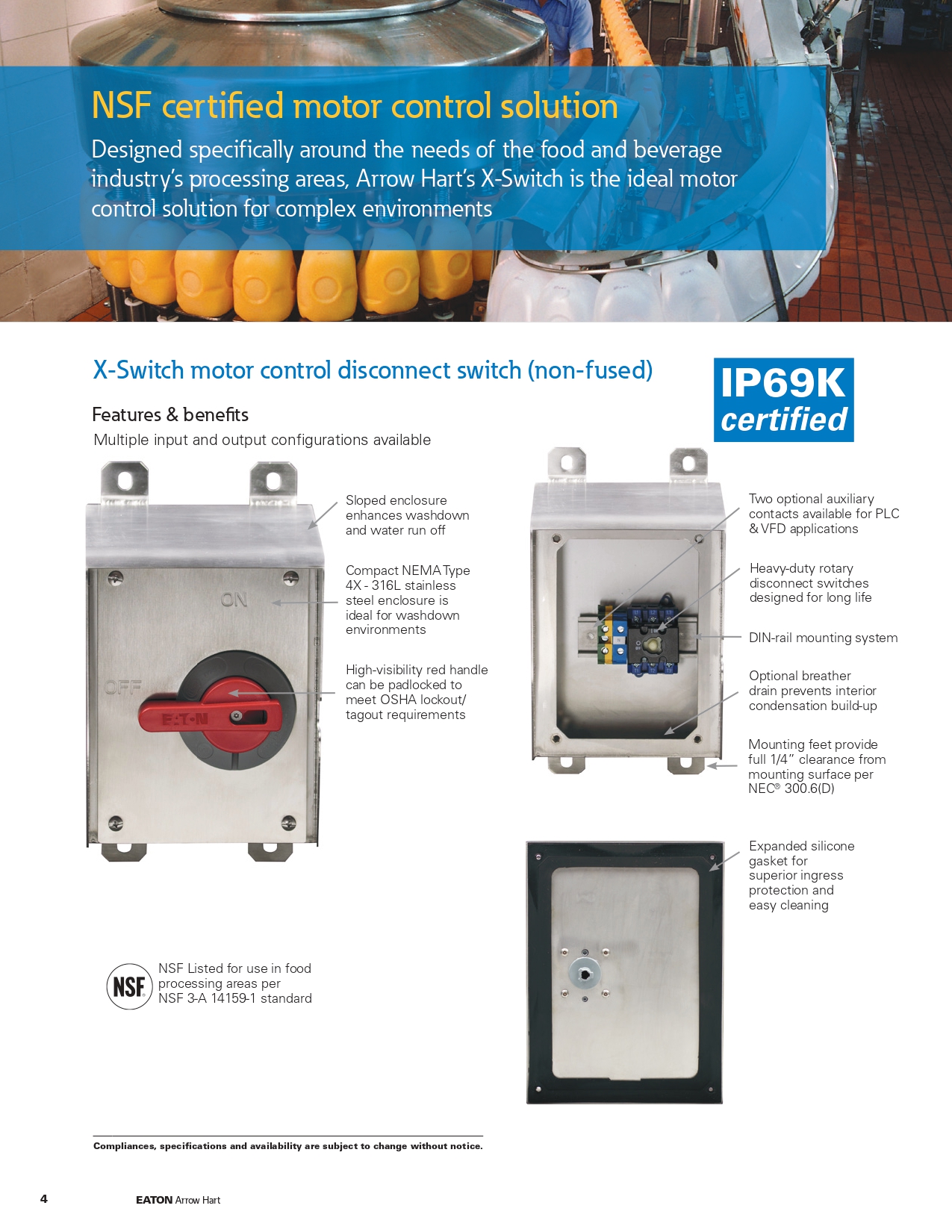 Offering flexible and economical designs for both fused and non-fused applications, Eaton’s Arrow Hart motor control disconnect switches are built for use in harsh industrial applications to address the needs of safety, reduced downtime and code compliance. Our industrial grade, electrical motor controls feature durable lever handles and switch mechanisms that will withstand repeated use in harsh environments, with NEMA Type 4X housings that can be padlocked to OHSA lockout/tagout 1910.147 requirements. Additionally, our non-fused motor control disconnect switch and our new stainless-steel X-Switch are NSF listed for use in food processing.