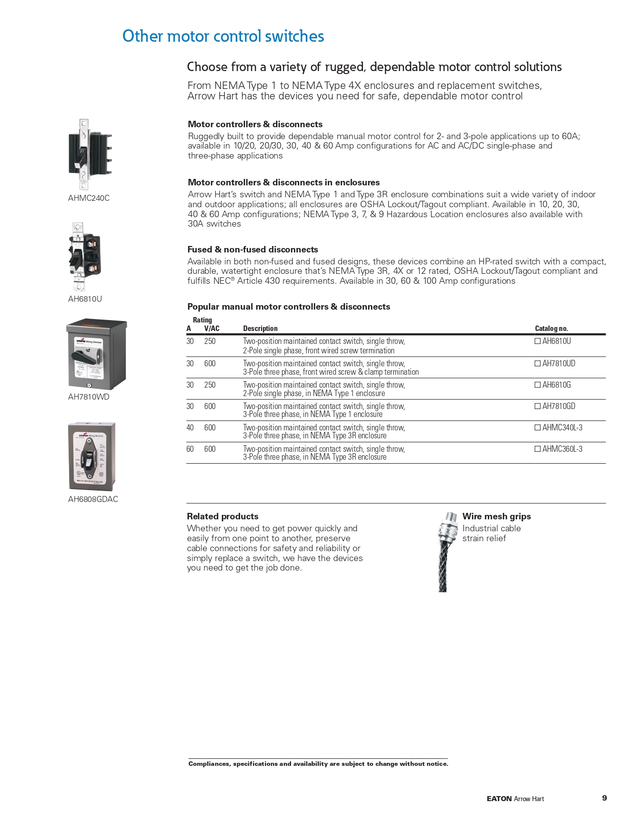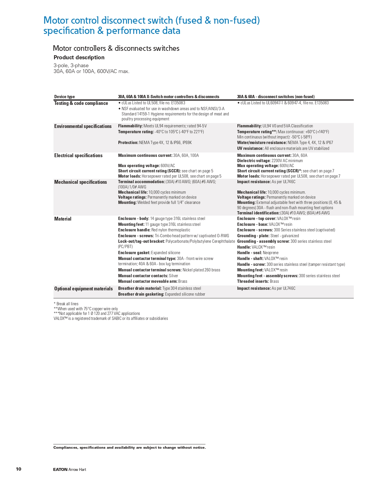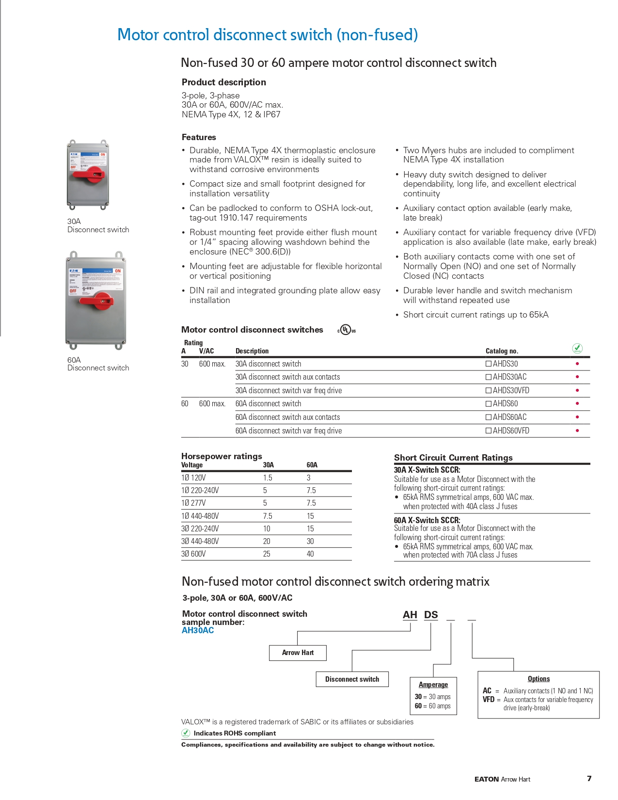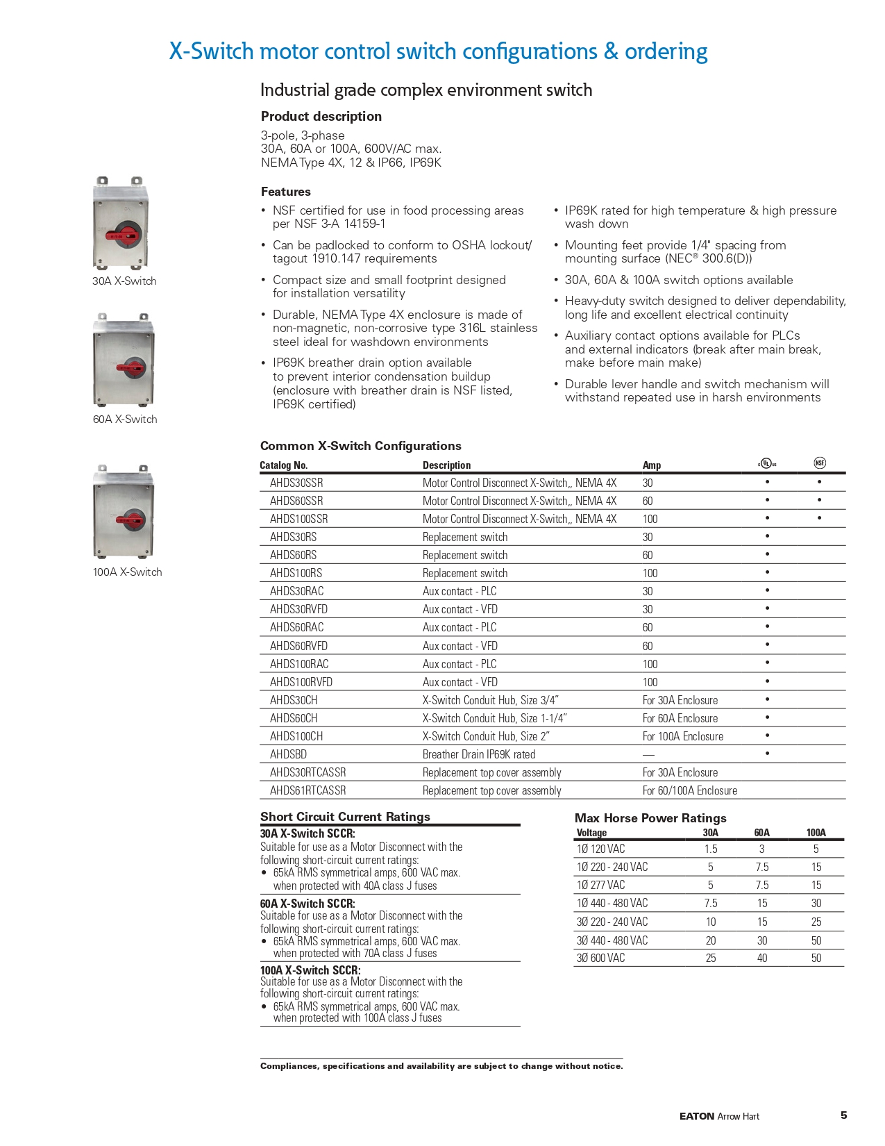 Offering flexible and economical designs for both fused and non-fused applications, Eaton’s Arrow Hart motor control disconnect switches are built for use in harsh industrial applications to address the needs of safety, reduced downtime and code compliance. Our industrial grade, electrical motor controls feature durable lever handles and switch mechanisms that will withstand repeated use in harsh environments, with NEMA Type 4X housings that can be padlocked to OHSA lockout/tagout 1910.147 requirements. Additionally, our non-fused motor control disconnect switch and our new stainless-steel X-Switch are NSF listed for use in food processing.