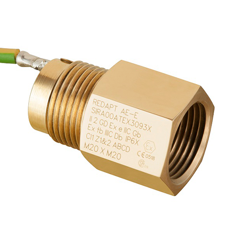 Redapt AE-E series Exe “increased safety” earth lead adaptors provide a method of bonding a cable gland or conduit termination to a grounding point within an explosion-proof enclosure.