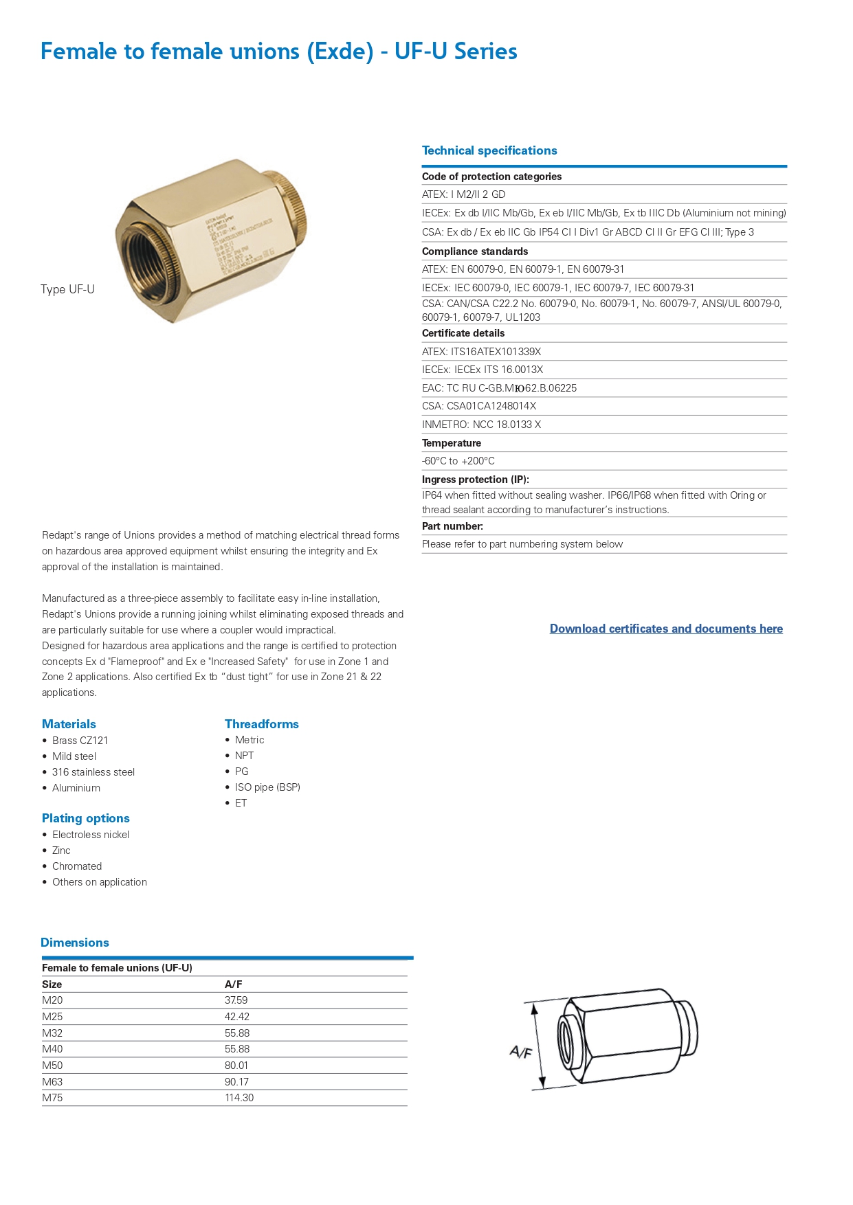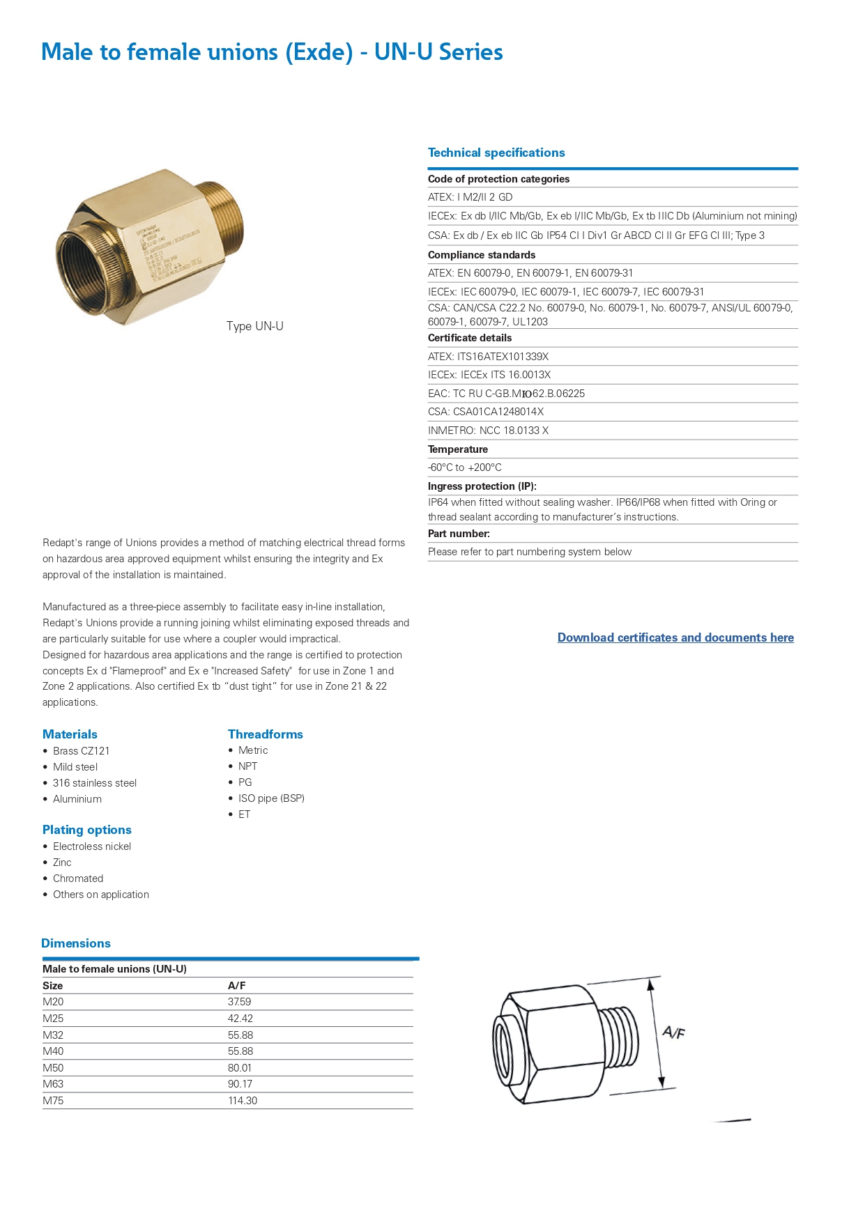 Redapt’s range of Unions provides a method of matching electrical thread forms on hazardous area approved equipment whilst ensuring the integrity and Ex approval of the installation is maintained.