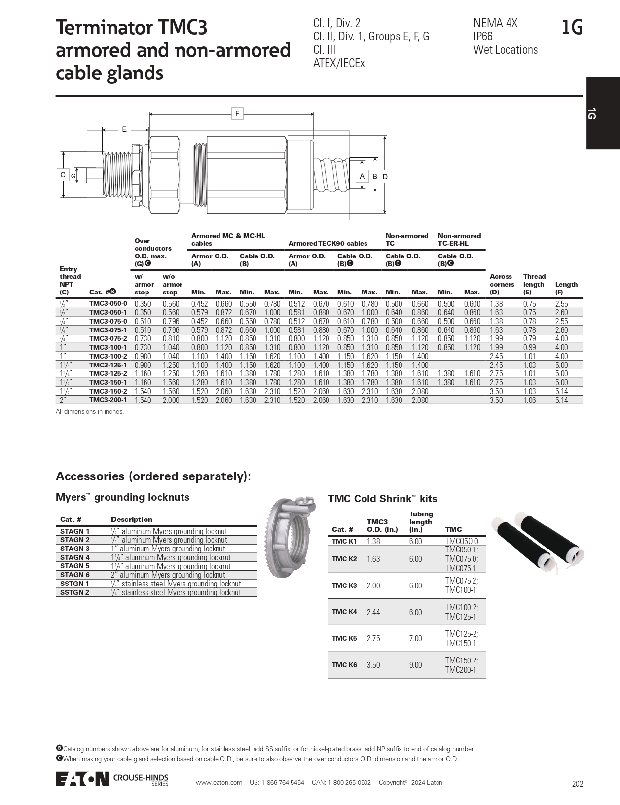 For use with metal-clad cable, TECK corrugated cable, or non-armored tray cables, Crouse-Hinds series TMC3 cable glands provide a means for terminating at junction boxes, control centers, panelboards and enclosures for motor control and electrical distribution equipment.