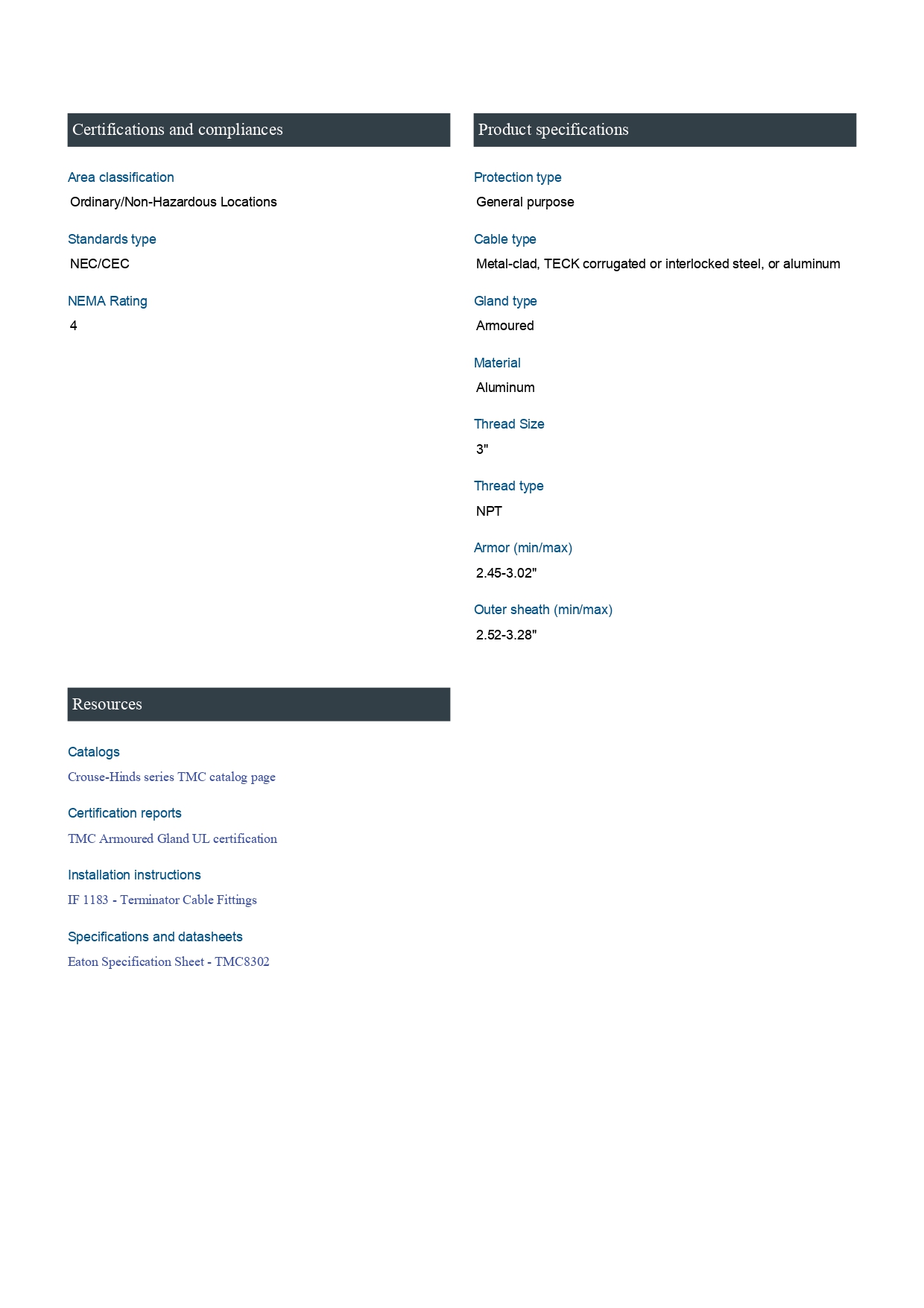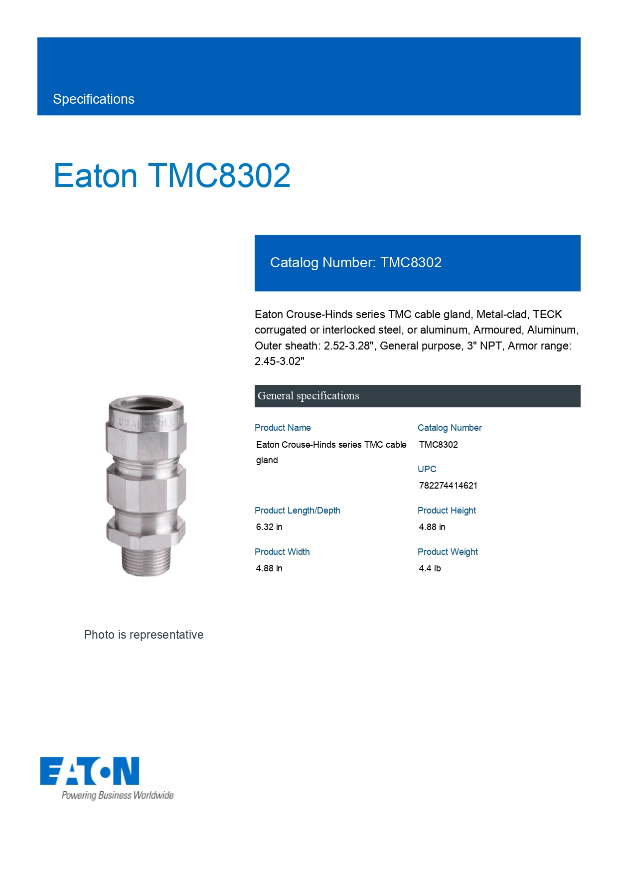 The TMC8302 is a high-performance cable gland from Eaton’s Crouse-Hinds series. It’s designed to secure and protect metal-clad, TECK corrugated, or interlocked steel/aluminum cables, providing a reliable solution for various industrial applications.