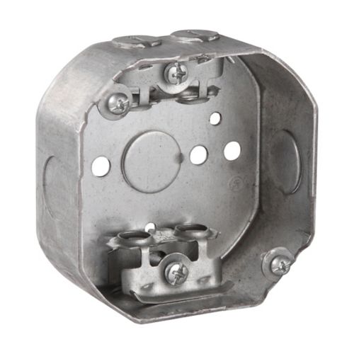 The Eaton TP310PF is a 4-inch octagon outlet box designed for secure and efficient electrical wiring in residential, commercial, and industrial applications. With a 15.5 cubic inch capacity, durable steel construction, and a pre-installed ground screw with a pigtail lead, this UL Listed junction box ensures compliance with National Electrical Code (NEC) standards.